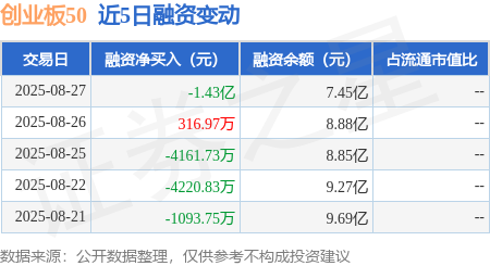 本站消息,8月27日,创业板50(159949)融资买入1.82亿元,融资偿还3.25亿元,融资净卖出1.43亿元,融资余额7.45亿元。